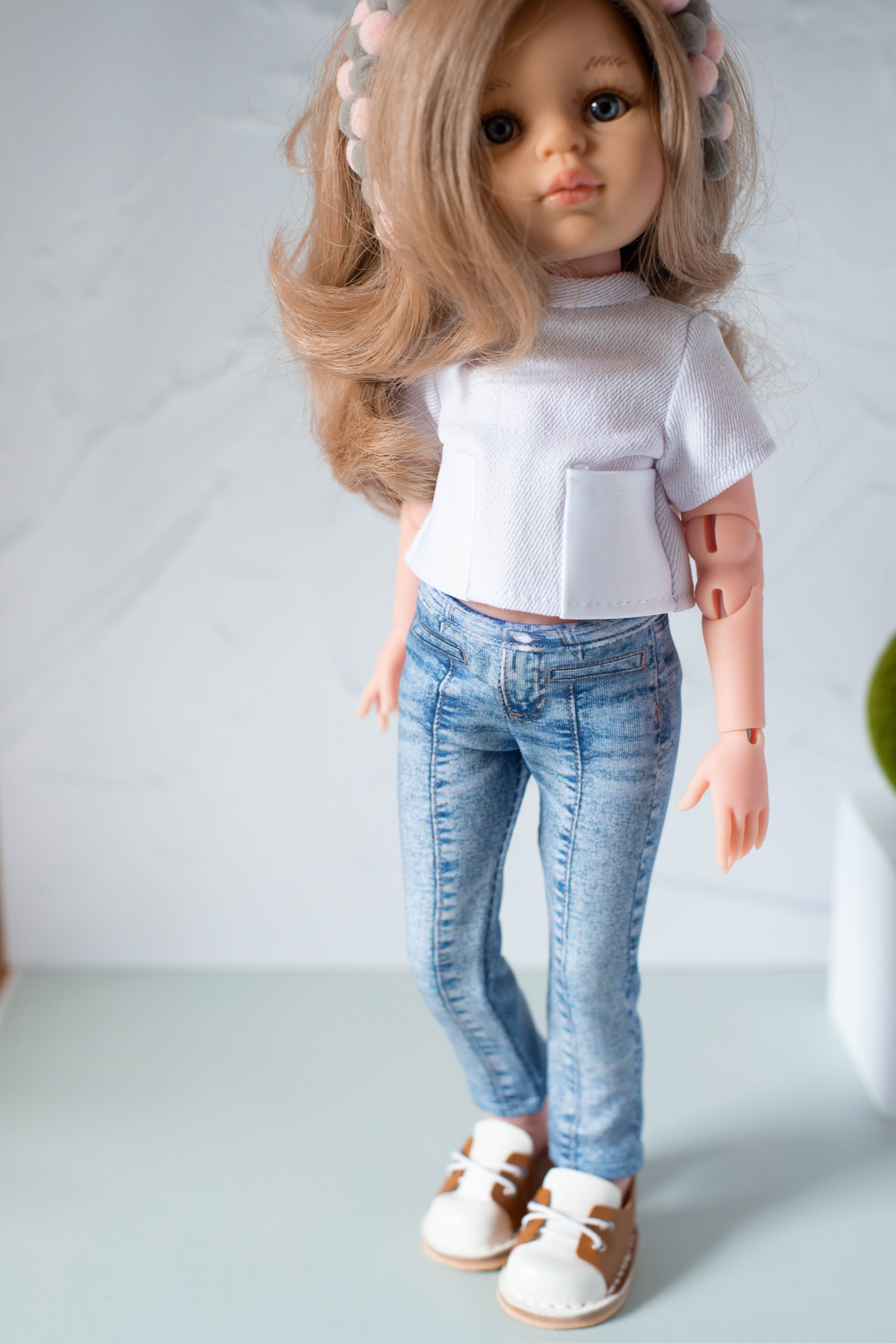 These jeggings imitate fabric of jeans, all details are printed. Trousers are made from elastic fabric, so doll can be positioned in any pose in this jeggings. Fabric does not shed and does not leave stains. Materials: jersey with prints 'jeans'.